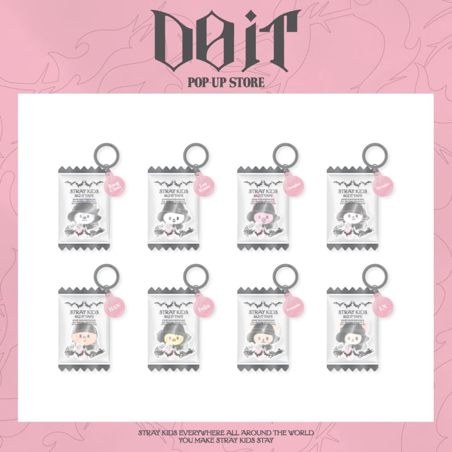 Chaque porte-clé contient une illustration adorable de ton SKZOO préféré, secouable et décorée de petits détails roses et noirs inspirés de l’esthétique mystérieuse et élégante de cette ère DO IT.
