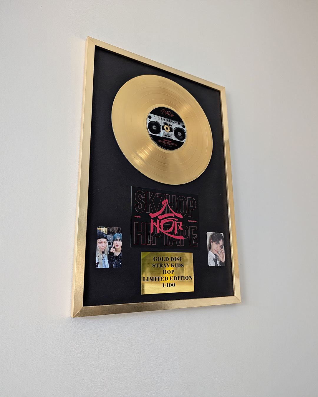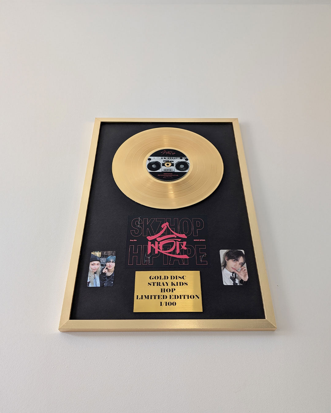 Chaque disque d’or Stray Kids est customisé à la main en France, avec soin et passion, pour offrir une finition haut de gamme et un objet de collection unique.