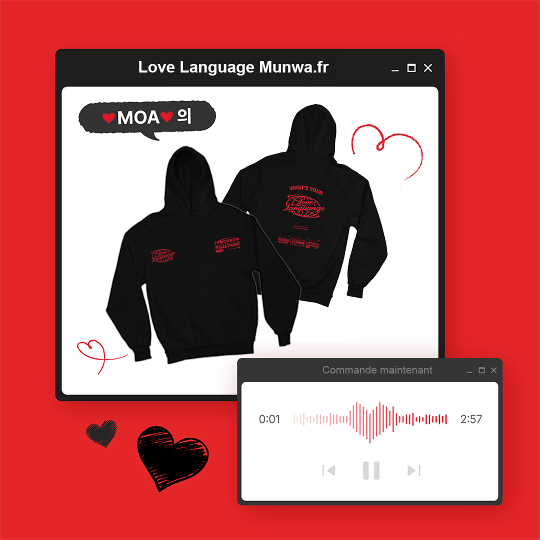 Ce sweat s’inspire du titre “Love Language” de Tomorrow X Together — une balade à la fois tendre et mélancolique sur les connexions manquées à l’ère digitale. Pensé comme une extension visuelle du morceau, il mélange influences Y2K, touches cyber-romantiques et symboles TXT pour exprimer ce que les mots seuls ne suffisent pas à traduire.